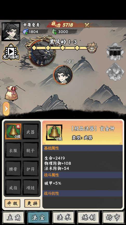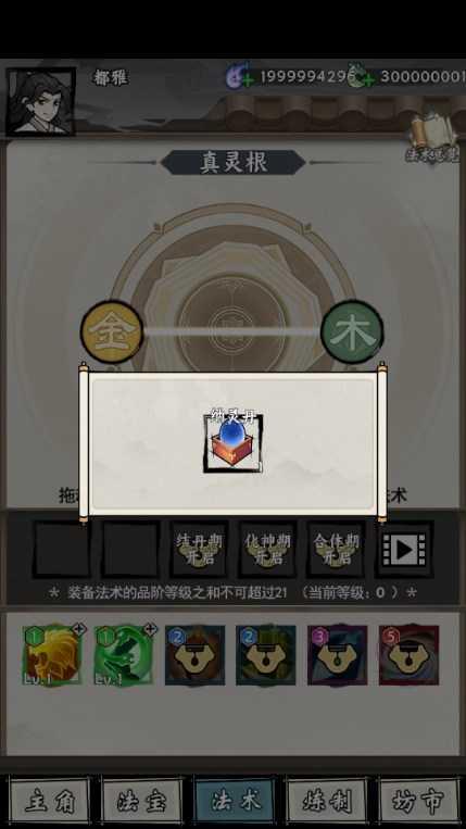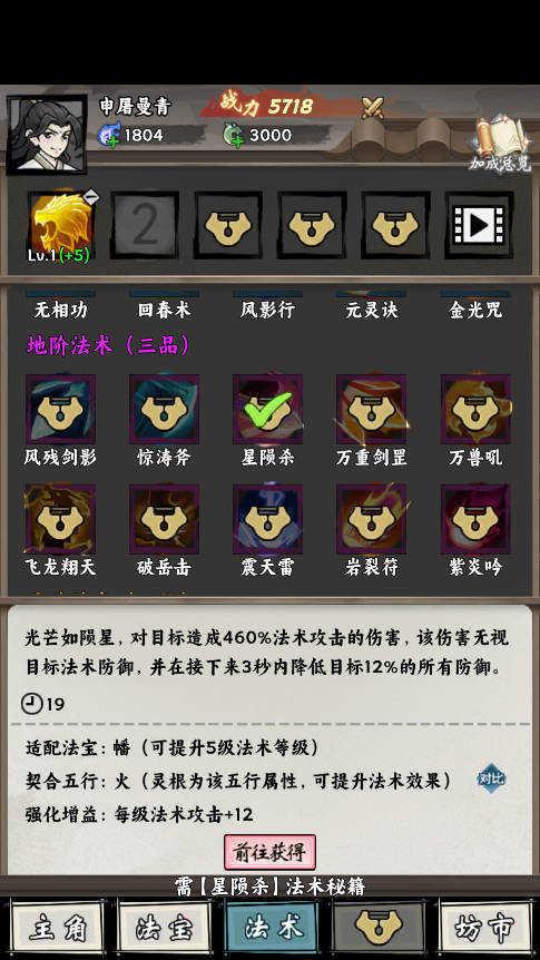 2.法术有五个装备槽,通过角色练气阶段解锁,看广告可以增加一个。法术目前六种,前期槽位不足的时候有搭配选择空间。更多法术可以在坊市中消耗资源购买,消耗资源较多。