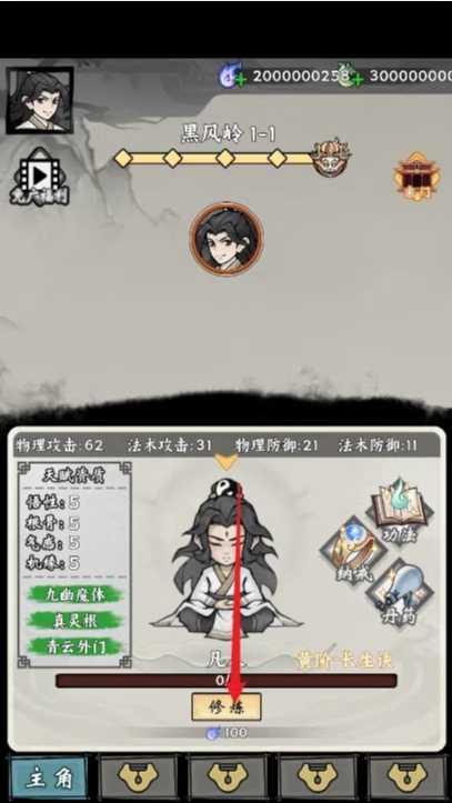 4.你可以点击下方的修炼按钮,来提升自己角色的修为。