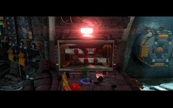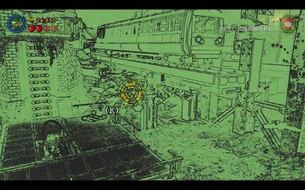 注意拐弯处有黄色的小型积木可以搭成通往对面的绳索。借助绳索爬到对面平台,让Batman换上Demolition suit(该服饰可以放置定时炸弹)。
