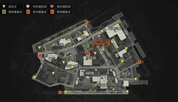 除了这两处撤离点外,地图中还有两个概率撤离点和两个条件撤离点。位于地图西侧餐厅附近的西区哨卡撤离点(5号撤离点)和位于郁金香街东的撤离点(3号撤离点),有50%的概率开启。地图北部的邮局北侧撤离点(4号撤离点)需要穿戴“民兵胸挂甲”并坚守20秒才能撤离,“民兵胸挂甲”可以通过淘汰附近的游荡者获取。地图南部的行政区西撤离点(6号撤离点)需要上交两枚身份牌,并坚守20秒即可撤离。如果在行政楼区域激战之后,不想冒风险从下水道或者直升机撤离,那么交身份牌撤离无疑是最佳选择。