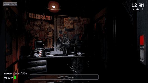 每局游戏开始时都会有一百的电量。开灯、打开监控、关门都会增加耗电速率(在Usage一栏,格子越多耗电越快)。同时你什么也不做也会耗电(看到那台风扇和那盏灯了吗)。当电量归零时,屏幕暗下去,两侧门打开,隔一段时间熊就会来跳杀你(第一夜没有熊也会跳吓,我曾经以为第一夜熊不会跳吓,然后被吓得差点砸烂电脑屏幕)。