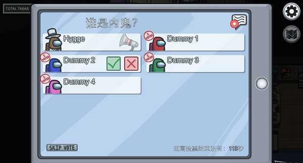 在紧急会议界面玩家可以通过语音或者打字交流,选出大家都认为是内鬼的玩家,点击该玩家头像后点击对勾确认投票。全部玩家投票或弃票后结算,获得票数最多的玩家会被驱逐离开本局比赛,当所有的内鬼被驱逐出去后好人胜利游戏结束。