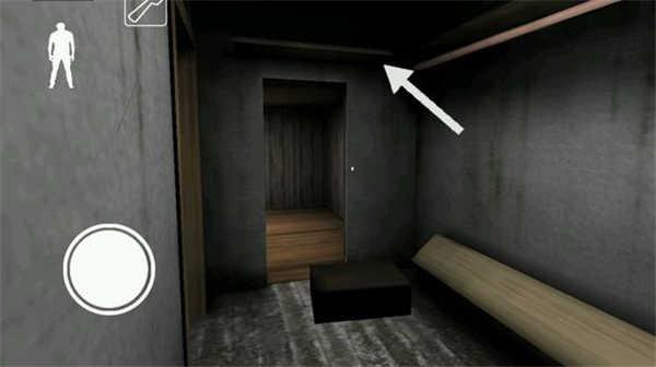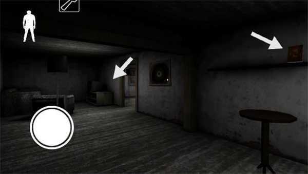 下楼梯后左边的地板上有一根黑线,从上面走过铃铛会响,需要注意。楼梯旁的柜子里可以躲,柜子对面有一个门,里面可能刷东西。柜子旁边有一个门通向地下室(由于画面较暗