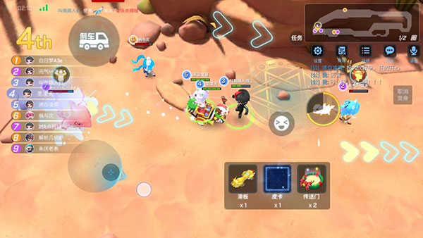 这是一个看脸(运气上的)的路段,说不定刚攒好皮卡捣弹冲锋用出来准备反超第一,直接来个恐龙怼你脸上,简单来说非常的高血压。传送门,护盾是首选。跳高,阻挡箱,滑板都可以跳过恐龙躲避伤害。如果想要配合皮卡,捣弹等载具走,配合气垫效果非常好。如果是在最后一圈,可以刻意呆在第二留一个巡航导弹,这样轻松反超。
