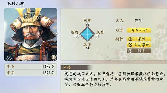1.蒲生氏乡(最后一个字不会打,人物简介说织田信长收为一门的),这一看特性就知道很牛,一开始有他这个人物就给他普代和康贝,用他来偷袭明秃顶,非常高的通过率,不过也有失败的占比,不大;搭配一个带1000多兵的弓手15000人如瓜果蔬菜一样被切。不用什么正清哪些玄以什么三成的冲过来。