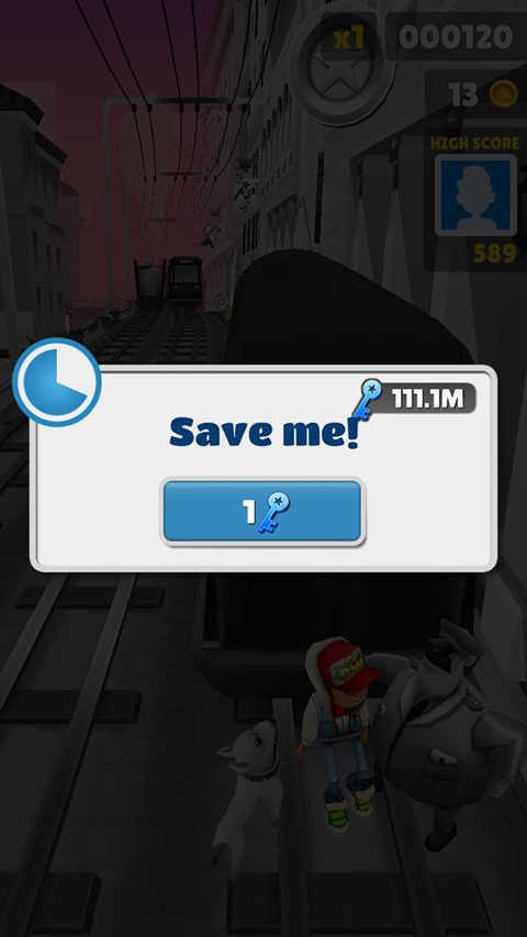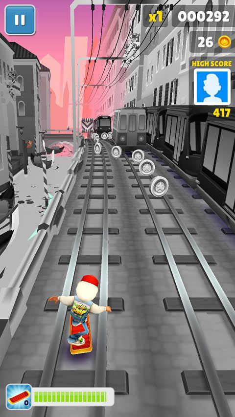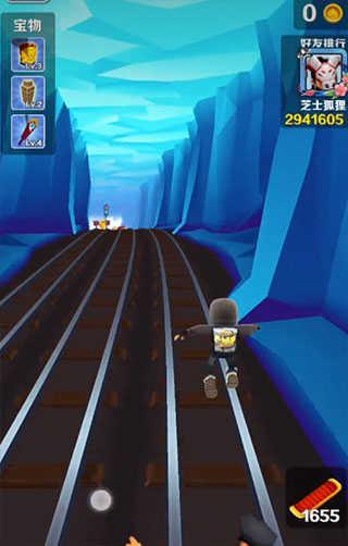 双击屏幕可启动滑板道具,如果在没有启动滑板功能的情况下,角色撞上障碍物或者火车游戏就会结束,而在滑板状态下,等于给角色买了保险,滑板会在撞到障碍物时消失,但游戏可以继续进行。滑板在消失后的几秒内出现冷却时间,当闪烁结束后可通过双击再次启动,没有次数的限制。