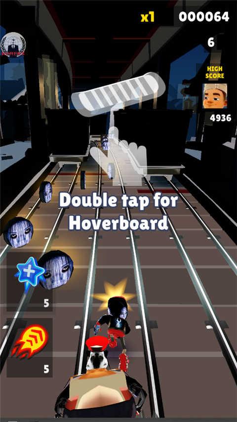 2、双击屏幕可以使用道具滑板,它可以帮助你提高得分,并且撞击还会为你清除障碍,但是滑板会消失。