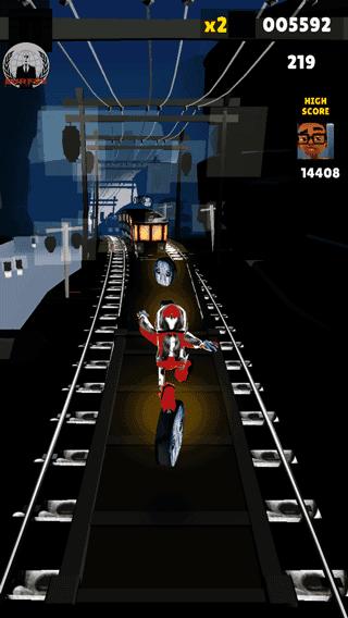 3、游戏的场景由经典的地铁场景变成了黑白像素的洛阳场景,并且随处可见贞子元素,我那家碰到障碍时,可以用手指滑动屏幕进行向下滑行、向上跳跃、左右转向等操作;