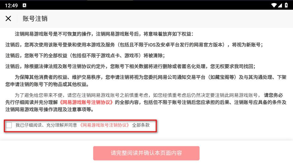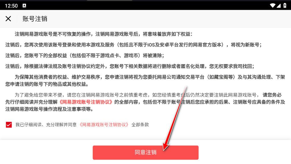 6.勾选这里的我已仔细阅读、充分理解并同意《网易游戏账号注销协议》全部条款