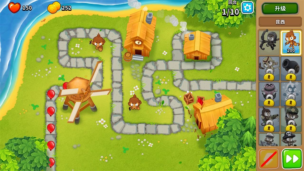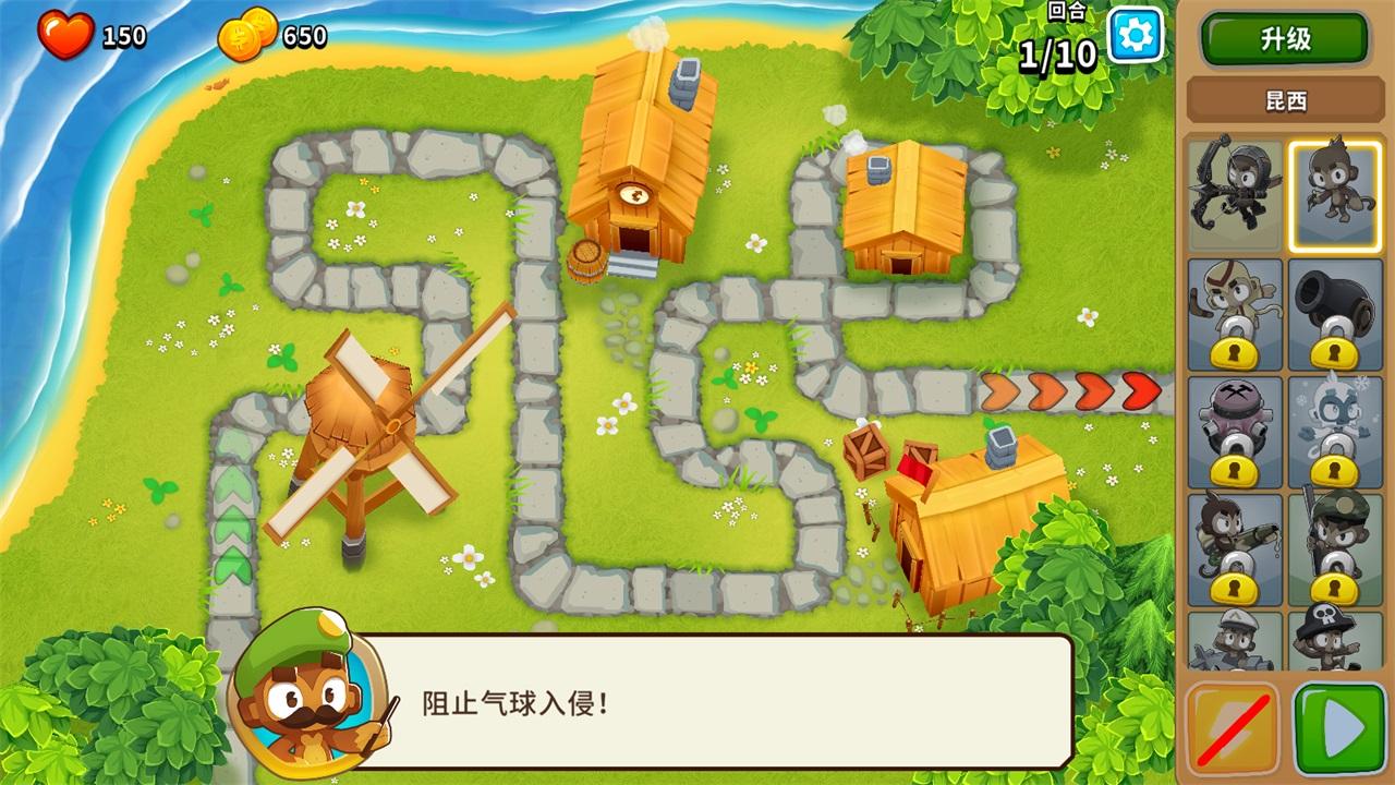 升级防御塔:玩家可以通过收集金币来升级防御塔,提升其攻击力和射程,以应对不断增强的气球进攻;