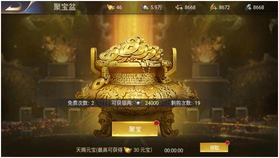 5. 聚宝盆:在大殿等级8级后解锁,有了聚宝盆就使用元宝换取银两。不过主要还是每天可以白嫖到元宝和大量银两,美滋滋。