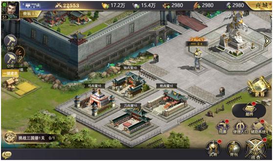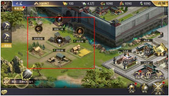 资源建筑在开始的时候就解锁了,其中包含四个建筑(伐木场、炼铁厂、民居、农田),分别产出不同的四种基础资源,伐木场产出木材,炼铁厂产出铁矿,民居产出银两,农田产出粮食。资源建筑可升级,越高级的建筑产出的收益就越高,平民的话最好优先升级资源建筑,这样可以很大缓解后期的资源压力。