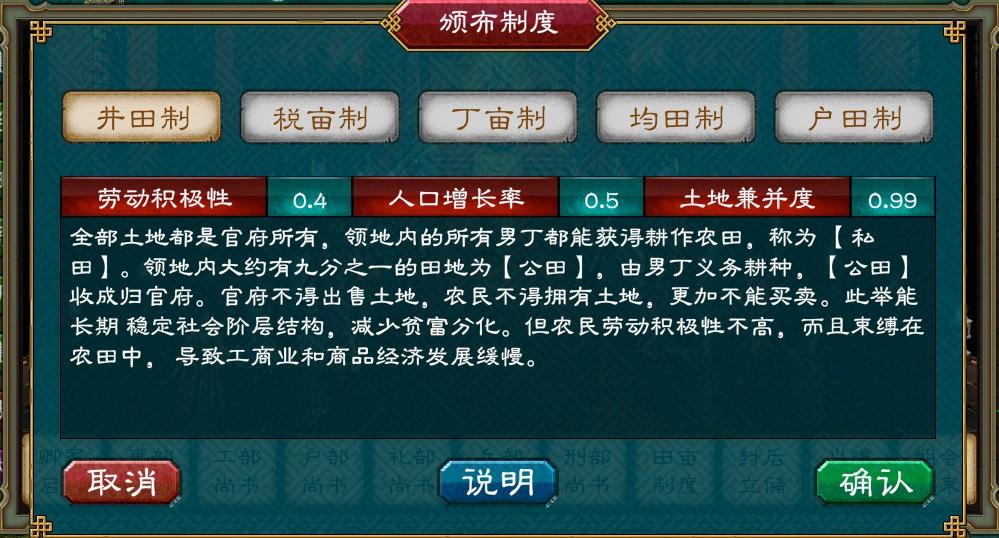 开局是默认井田制的,在粮价提高到一定程度,说明民众私有财产丰裕的话,可以转化为其他私田制。但切记,一旦实施私田制,农民将离开田地,只能通过购买或出租来获得生产资料。所以制度改变后,务必把田地出租或出售,否则国家将没有粮食产出了。具体详细看副标题:《田亩制度详细解释》