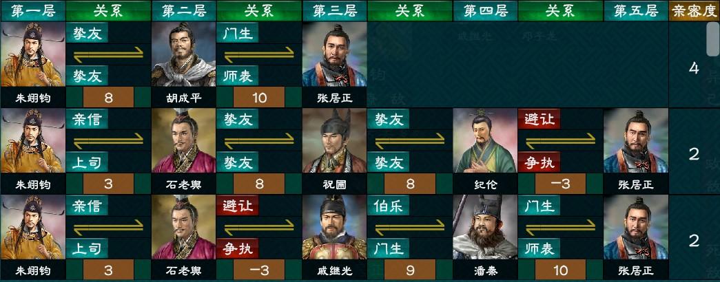 人物关系会影响官员的完成任务的方方面面,很多理所当然的事情会纳入人物关系,如部队战斗力,本帅与敌人的仇恨,内政、宴会等。官员还有私产系统,还会暗地里四处购置田产,在朝廷启奏环节会基于私产、人际关系、官位等因素斗争。具体详细看副标题:《人物关系详细解释》