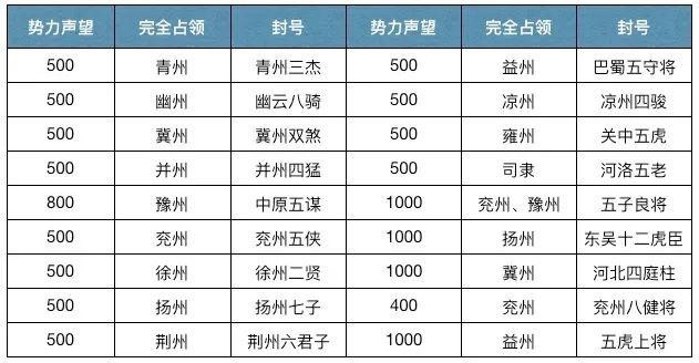 论功行赏:三国及之前的剧本有效,当一个政权的实力和等级达到一定程度,并占领了某些特定地区,会获得某些公认的称号,如“五虎上将”,可以颁发给下辖武将: