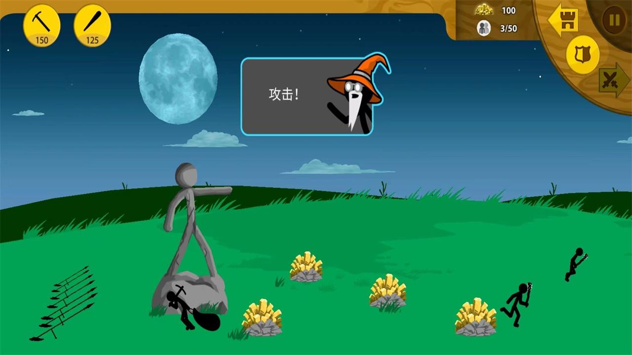 然后等敌人来了后控制矛兵,然后让矿工撤退,让城堡弓兵射,你就顶个盾吸引伤害不让敌人打雕像就行了