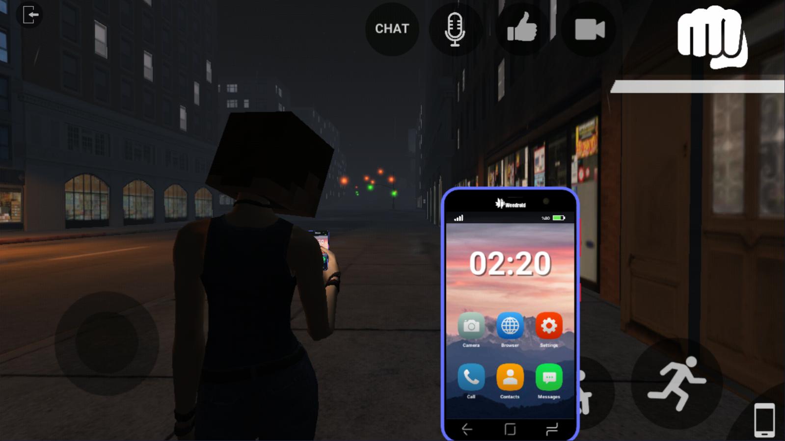 4、进入游戏里,可以先点击【chat】对话,左边的圆圈是前进或者后退,右边则是蹲下和跳跃