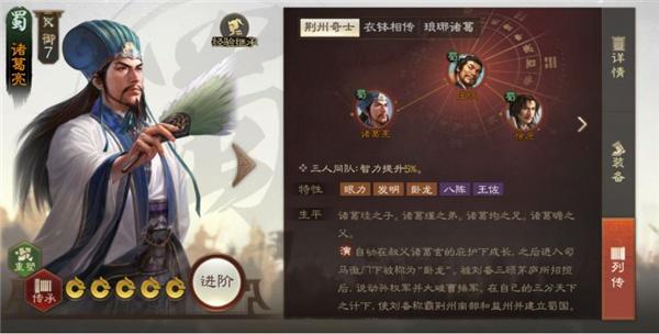 以牺牲掉防御来追求输出的阵容,在实力较弱的战斗中可以做到快速通关,但是在实力不分伯仲的情况下,整个阵容就相当脆了,这时可以舍弃掉衣钵相传这个羁绊,换成廖化和张飞来保住诸葛亮。