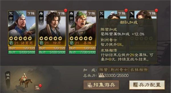 五人全是蜀国阵营的,同时上阵获得12%的属性加成,诸葛亮、庞统、徐庶三人同队获得荆州奇士的羁绊,智力提升5%,给诸葛亮带来输出加成,另外两位武将用黄月英和姜维解锁衣钵相传羁绊,行动结束后提升2%全属性,可叠加八次,持续至战斗结束。