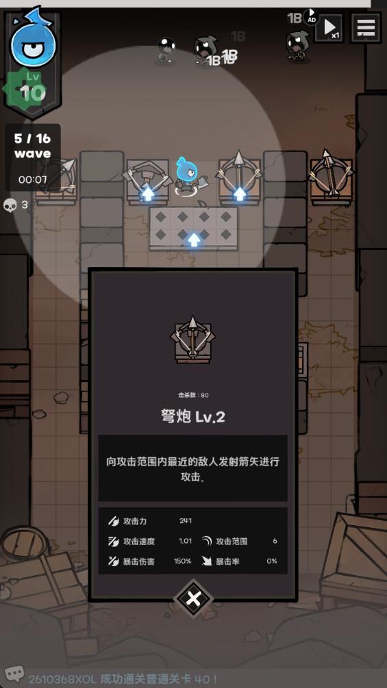 2.死掉的怪物会掉落经验值,经验值攒够之后又可以选择增加炮塔或者提升增益。