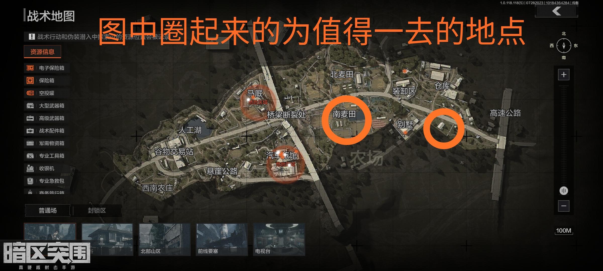 右侧下方则可以根据情况是否搜索别墅。搜索完别墅前往汽车旅馆必经之地是南麦田,路过也可以顺手搜一下红色信号塔边上的小屋,最后要去的是汽车旅馆,一般到这个时候已经有人来过了,简单搜索之后就可以撤离了