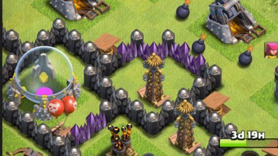 敌人在黑圈处下的炸弹人会跑去红圈处开墙,中间的法师塔有机会秒杀他们。部落城堡是新手的最强防御建筑,部落城堡里涌出的弓箭手,法师,气球,或者龙将会是许多进攻者的噩梦。布阵时切记尽量将部落城堡放置在阵型的中央,不要让敌人能轻易的勾引出你的援兵。对于新手来说从头开始打造一个阵型肯定是非常困难的。你可以通过互联网来搜索一个适合你的框架,然后通过自己的经验来改良,从而创造出一个独一无二的阵型。
