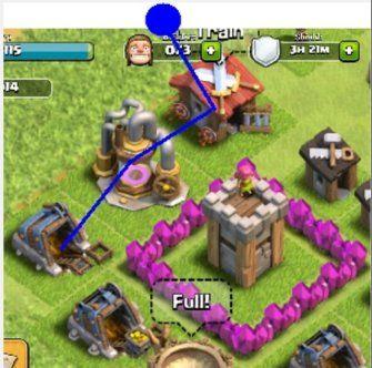 如果敌人在蓝点下弓箭手的话弓箭手的攻击顺序会是训练营-圣水采集器-金矿。需要注意的是地图的四条边并不能用来替代城墙,阻挡敌人的进攻。如下图:
