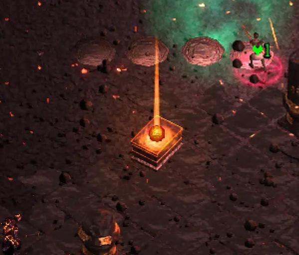 (5)四处寻找,可以找到一个发光的灯台,靠近灯台可以让光线方向旋转90°,需要调整到特定的角度让光线能够射到下一个灯台上,这样不断反射直到能够将书旁边的水晶柱子照亮,被照亮后水晶柱子会显示一个范围,在这个范围内水晶会持续攻击进入的怪物(伤害很高,但频率一般)。