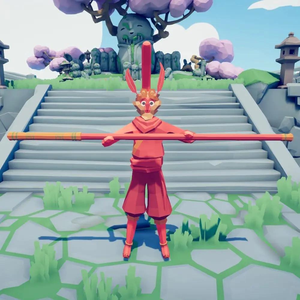 3.作为TABS的近战角色,猴王手执猴王棒行走在战场上,行至一定距离范围以内将发动【猴王跳】技能,纵身一跃朝着敌人扑上去扭打在一起。猴王棒攻击速度快,冷却时间短,在战斗中棍棒将进一步伸长,横扫攻击的范围优势对于控制敌群非常实用。