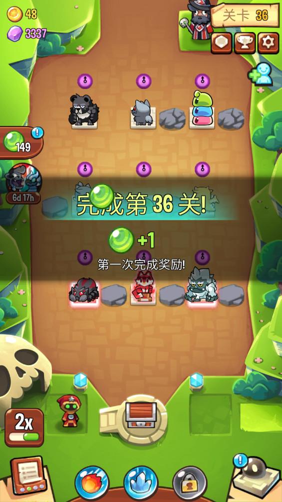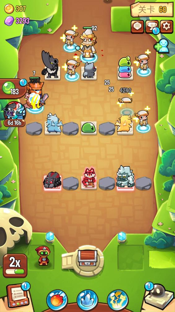 当你的怪物积累到一定程度,你就有了攻击和攻击速度的赌注,你也有了像样的攻击者。这个阶段你会发现这款游戏的主要玩法是第一排的怪摆,左右插木桩可以清除90%以上的怪物。当你的输出手和木桩达到40-60级时,一般可以顺利通过第一关。