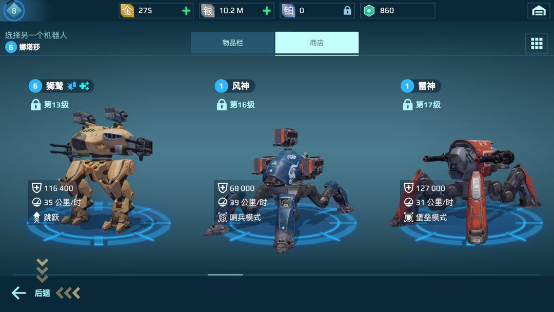 机甲会随着指挥官等级的提升,逐渐开放购买权限。譬如性价比极高的强力蓝色机甲【娜塔莎】将会在7级解锁,拥有强大机动性的蓝色机甲【狮鹫】在13级解锁。拥有“堡垒”之称的【风神】与【雷神】则分别在指挥官到达16级与17级是解锁。