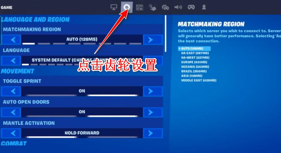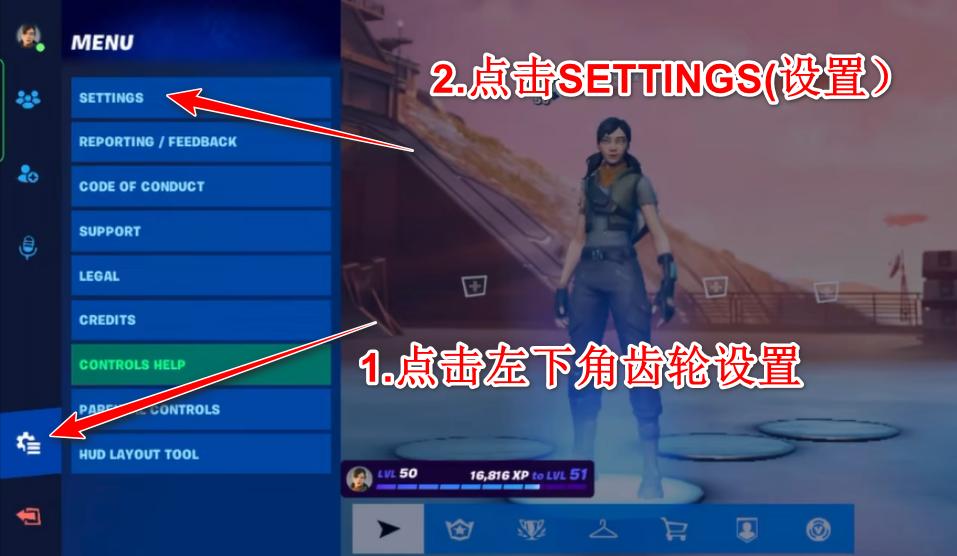 1.进入游戏主页之后点击左下角齿轮设置,然后点击SETTINGS(设置)
