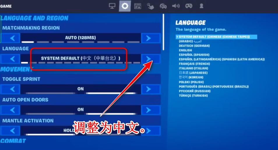 3.点击LANGUAGE(语言)右边的箭头调整语言文中文。