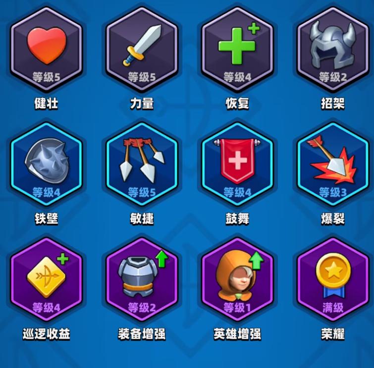 紫色史诗天赋从左到右分别为:巡逻收益、装备增强、英雄增强和荣耀。