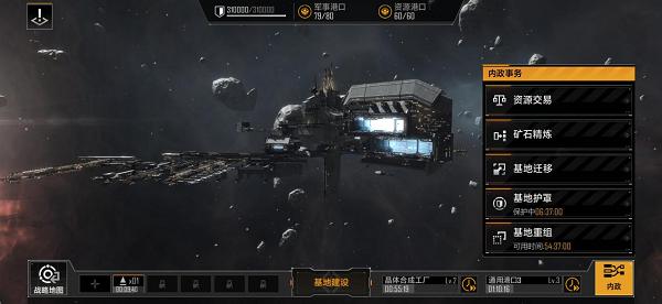 内政主要包括资源交易、矿石精炼、基地迁移、基地护罩、基地重组功能,不过大部分功能需要玩家提升自己的建筑等级才能解锁。前期新手玩家可以享受的是基地护罩保护自己度过新手期,以及不满意自己基地位置可以进行重组。