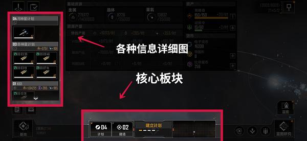 核心板块总共有四个功能板块,点击计划板块可以直接获取当前进行的所有计划详细信息图;点击建造板块,可以获得建筑建设的进度信息图;建立计划是最核心的板块功能,可以建立计划圈,所有的一切行动例如采矿、攻击敌方舰队等都需要构建计划圈,才可以进行行动;最后的板块是地图功能板块,属于缩减小型地图,可以大致观察你现在所在的周遭分布情况。