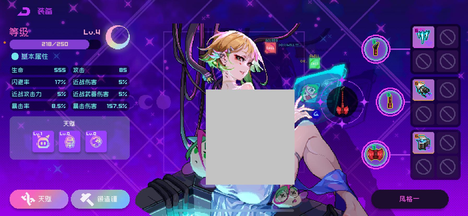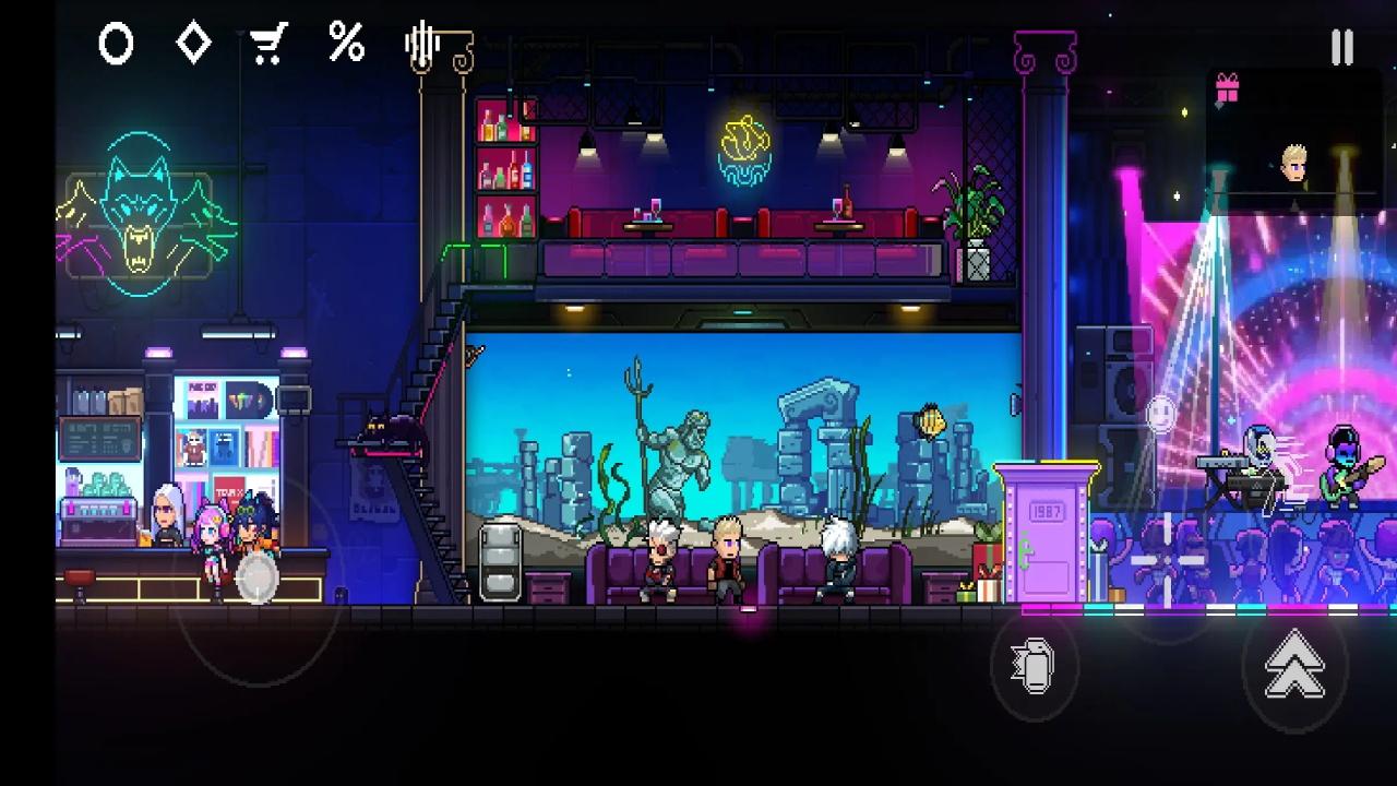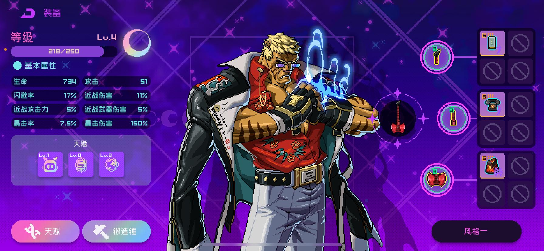 游戏整体设计以精致的像素风格为主,加以赛博朋克元素为辅,让游戏整体的视觉感受达到了一个顶峰,其次(霓虹)我可以解释为光污染嘛,绚丽的技能特效,加以街头式的背景音乐,沉浸感十足,唯一能打断我的就是被BOSS弄死的那一刻。