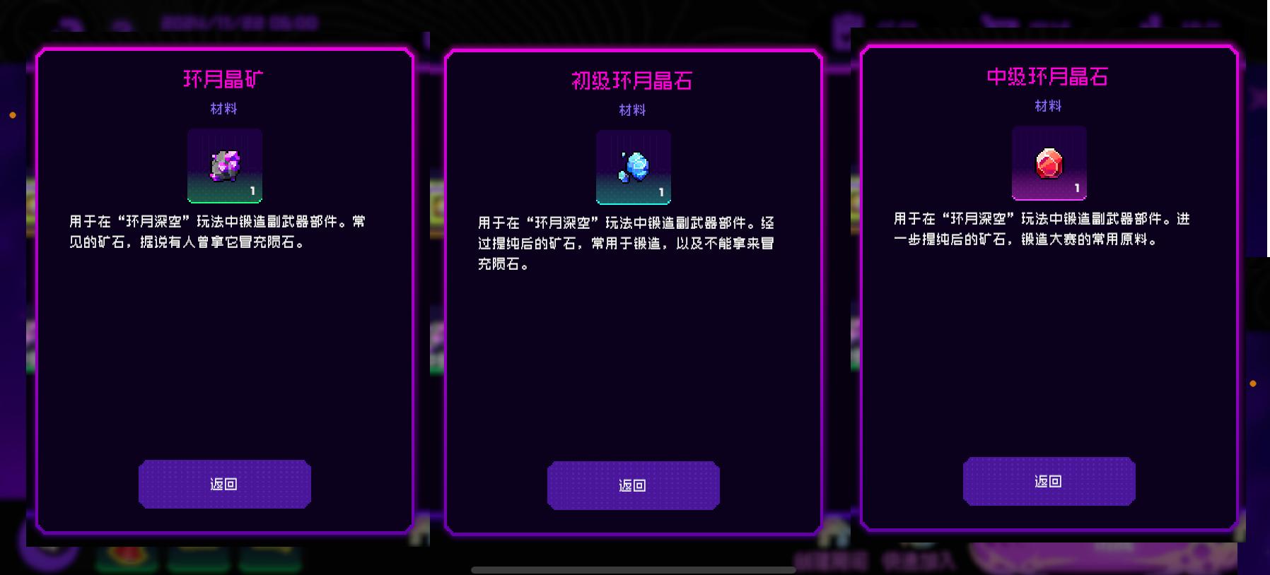 二. OK天赋就说完了,我们现在讲该如何佩戴纪念品,上面我引出了”环月晶石“这个物品,佩戴纪念品就和这个晶石有关,目前第一天的全服进度只能获取:环月晶矿、初级环月晶石、中级环月晶石,他们的主要作用是解锁武器,而解锁武器就代表着我们可以佩戴纪念品,这是这个模式独有的机制,你就当把纪念品镶在武器上这么理解就行。