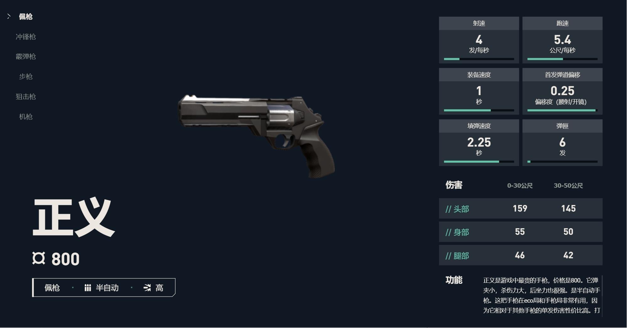 正义(售价800)是一把考验枪法和心理素质的左轮手枪。弹容量6发,备弹24发,射速4发/秒,0-30米头部伤害159(衰减后145),上身55(衰减后50),下身46(衰减后42)。命中头部可瞬秒任何敌人,精准度极高。但高售价使其往往需要舍弃技能和护甲,弹容量少,失误代价大。适合枪法自信的玩家,多熟悉地图点位有助于发挥其优势,也可尝试让队友发枪,自己购买小甲和技能