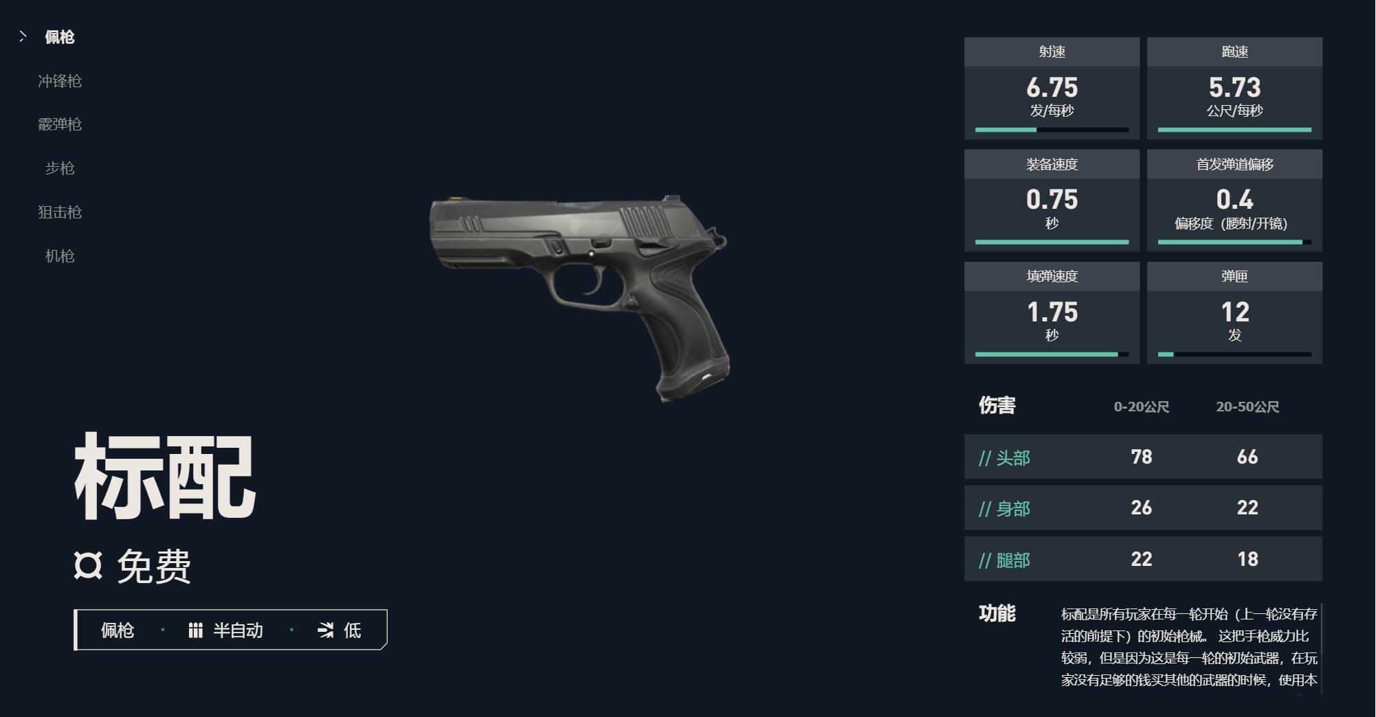 标配是唯一免费的手枪,堪称经济局的利器。它拥有半自动的主要攻击和霰弹模式的辅助攻击,弹容量12发,备弹36发,射速6.75发/秒,手持移速5.73米/秒。0-30米内,命中头部伤害78(衰减后66),上身26(衰减后22),下身22(衰减后18)。鼠标左键是半自动单发的模式,右键是类似于霰弹枪,一次性可以打出三发子弹由于它有这个特殊的右键开火模式,在近距离通过这个右键爆发性的伤害甚至有机会秒杀重型护甲敌人先左键打一发,再接个右键,就可以在最短时间内打出四发子弹其优势在于能节省经济用于购买护甲和技能,中近距离在护甲和技能加持下,甚至能与高出场率的鬼魅一较高下。但它无法应对远距离作战,在开阔地形易被反杀。实战中,可单人行动或配合队友辅助,辅助攻击的霰弹模式适合近距离遭遇战和拐角蹲守