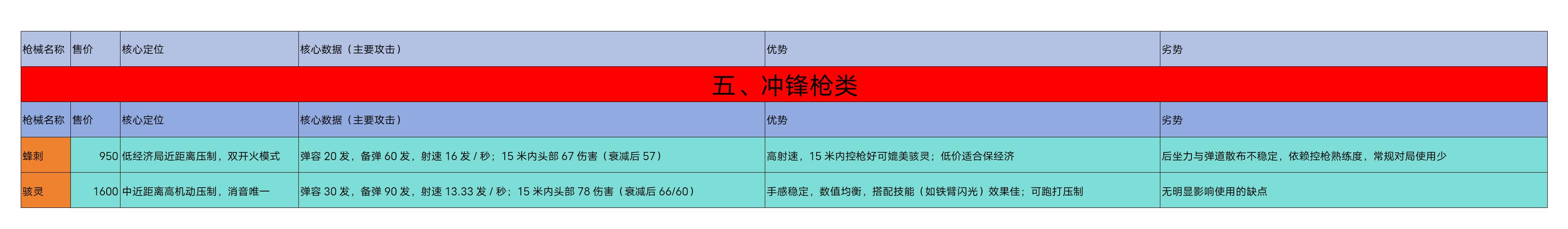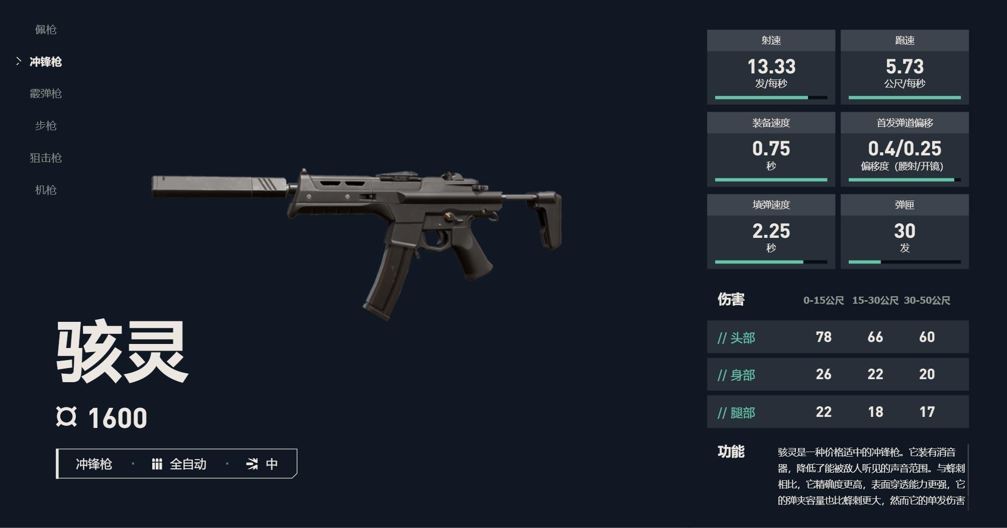 冲锋枪以其高射速和出色的机动性,成为近距离作战的利器,尤其适合快速突袭和绕后偷袭。蜂刺(售价950)蜂刺是一款售价低廉、拥有两种开火模式的高机动高射速冲锋枪,适用于部分低经济战局。弹容量20发,备弹量60发,射速高达16发/秒,手持移速5.73米/秒,装备速度0.75秒,换弹速度2.25秒。15米内命中头部伤害67(衰减后57),上身27(衰减后23),下身22(衰减后19)。射速极高,15米以内若能控好弹道,秒杀速度不逊色于售价更高的骇灵。低价特性使其在经济紧张时可作为过渡选择后坐力和弹道散布不稳定仅适用于单人摸身后偷背身、抽固定靶等场景,其他场景慎用;近距离可尝试跑打,但需谨慎。