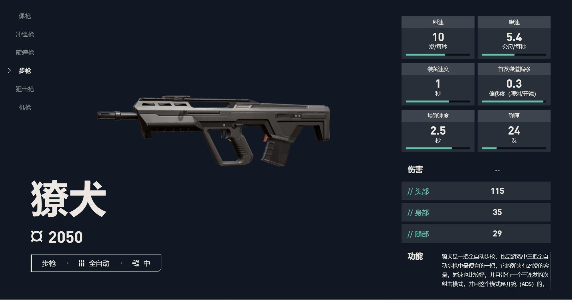 獠犬(售价2050)是步枪中售价最低的,拥有全自动与三连发两种攻击模式,全距离无伤害衰减。弹容量24发,备弹72发,射速10发/秒,头部伤害115,上身35,下身29。低价使其适合劣势局和低经济局,但近距离射速和伤害不足,远距离精准度欠佳,辅助攻击的三连发模式性价比低。实战中以稳健为主,依赖个人枪法,优先使用主要攻击模式。