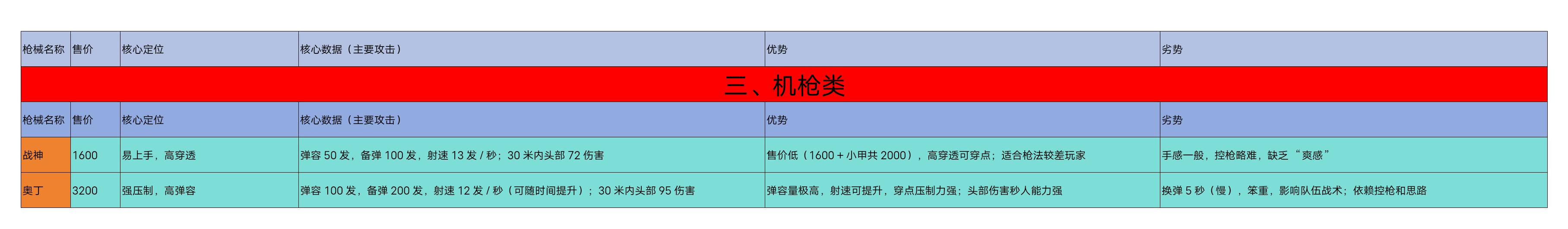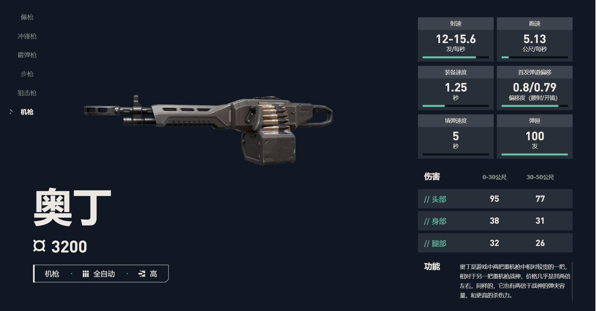 奥丁(售价3200)高弹容量、高穿透,实战表现强势。弹容量100发,备弹200发,射速12发/秒(可随时间提升),30米内头部伤害95(衰减后77),上身38(衰减后31),下身32(衰减后26)。弹容量大,射速可提升,穿点压制力强,头部伤害秒人能力出色。但换弹时间长(5秒),较为笨重,影响队伍战术。需要学会提前枪,保证为团队发挥作用。