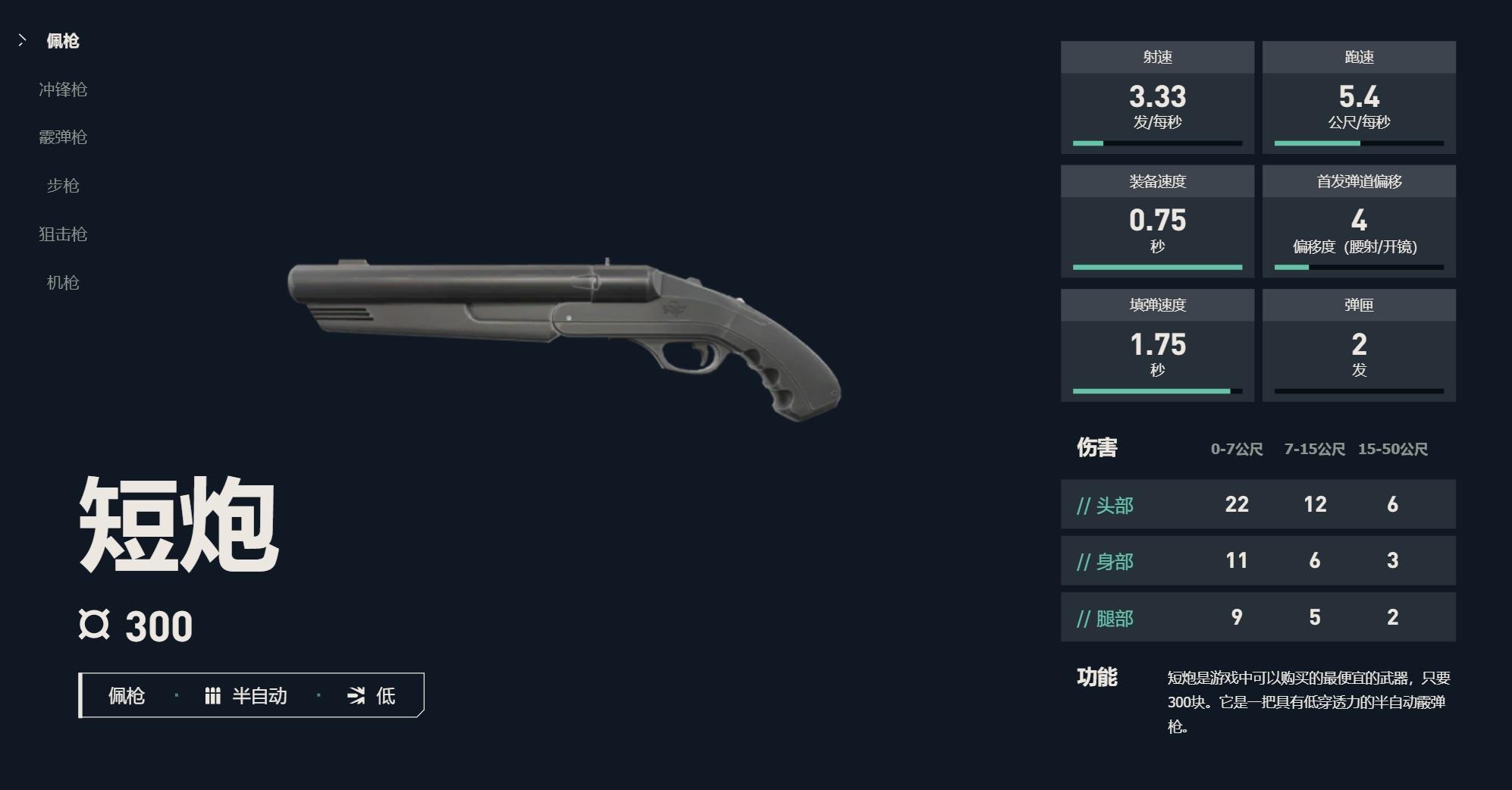 短炮(售价150)是近距离作战的王者。弹容量2发(单发15颗弹丸),备弹6发,0-7米内头部伤害22(衰减后12、6),上身11(衰减后6、3),下身9(衰减后5、2)。7米内可瞬秒敌人,包括带小甲的对手,守点和混烟蹲人效果极佳,且低价能节省经济购买技能。但超过7米后伤害衰减严重,弹容量不足,回防能力差。实战中适合蹲点偷袭,蹲下可减小弹道散布,回防时可捡起队友的标配备用。