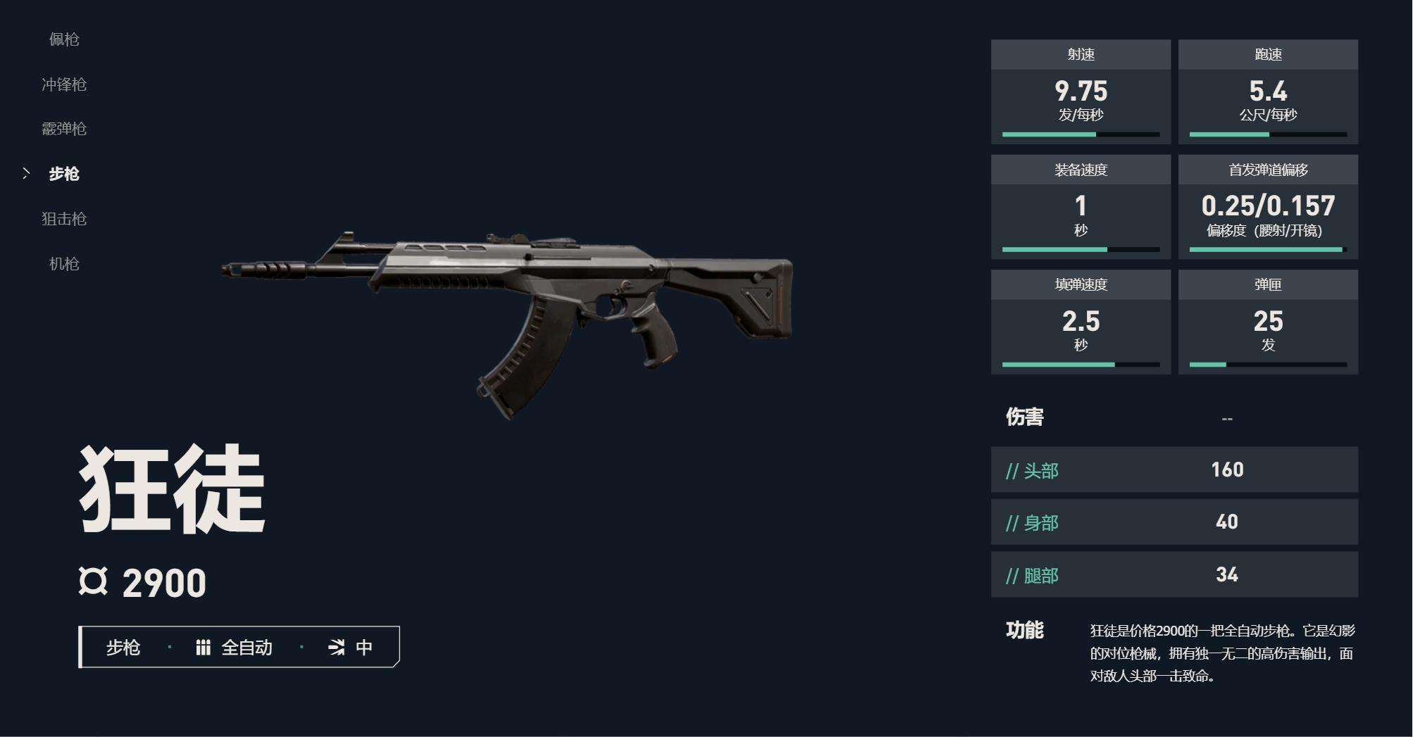 狂徒(售价2900)全距离无伤害衰减,性能强劲。弹容量25发,备弹50发,射速9.75发/秒,头部伤害160,上身40,下身34。命中头部可一击毙命,上身伤害也极具威胁。但后坐力需要控制,备弹量较少。实战中以打上身争头部为目标,过点时多利用技能掩护。
