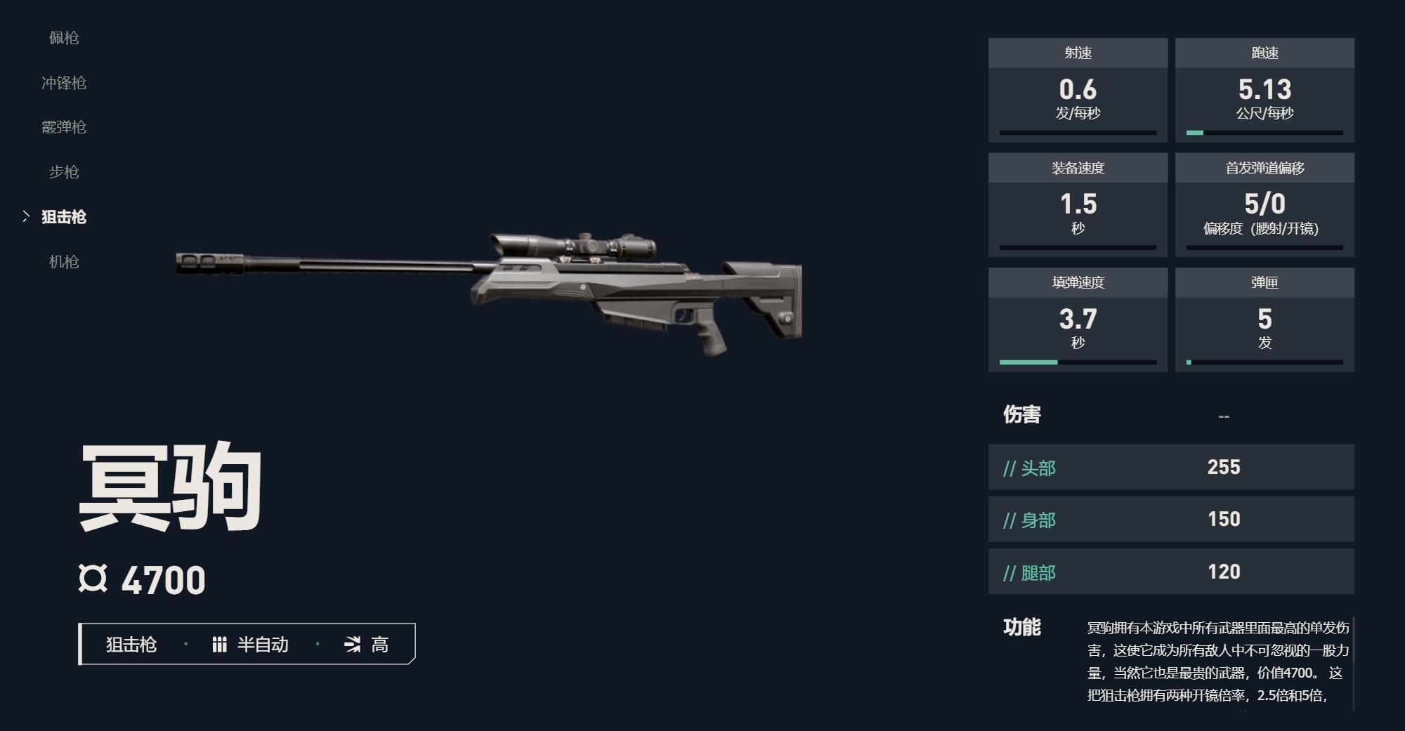 冥驹售价(4700)高伤害且双变焦,适用于中远距离清人,但使用条件苛刻。弹容量5发,备弹10发,射速0.6发/秒,头部伤害255,上身150,下身120。一枪躯干可以带走任何护甲类型的敌人,有着全游戏唯一的双倍镜,最高开镜倍率可达五倍较慢的拉穿速度和持枪移速架点和清人能力极强,上身伤害可秒大甲敌人,近战也有一战之力。然而,高售价使其经济风险大,射速慢,开完枪需频繁回掩体。建议守方使用,需根据敌人进攻习惯调整架点策略。