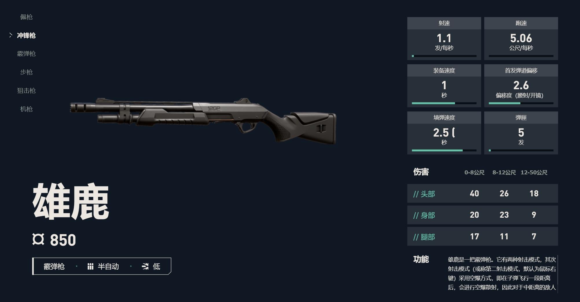 雄鹿(售价850)雄鹿是一款拥有较高爆发伤害的半自动霰弹枪,主要用于近距离遭遇战。弹容量5发,备弹量10发,射速1.1发/秒,手持移速5.06米/秒,装备速度1秒,换弹速度2.5秒。8米内命中头部伤害40(衰减后26、18),上身20(衰减后13、9),下身17(衰减后11、7)。近距离爆发伤害高,无需考虑精准定位和爆头,只要瞄准敌人就能一枪带走,搭配部分高机动性技能效果强劲。伤害衰减严重,仅在近距离有战斗力,脱离近距离后威胁大幅下降;在大地图中转点困难,空枪几次后极易陷入被动。合理运用闪光类等技能,抽死敌人后及时转回掩体;可利用拐角蹲点或卡墙,只要不被技能探点,不空枪就能轻松收掉敌人;其辅助攻击为空爆模式,发射的霰弹药筒在7.5米内命中仅造成1颗弹丸伤害,超过7.5米则散射为5颗弹丸,适用于中距离作战,但实测在手游中效果不佳,中距离建议换用手枪。