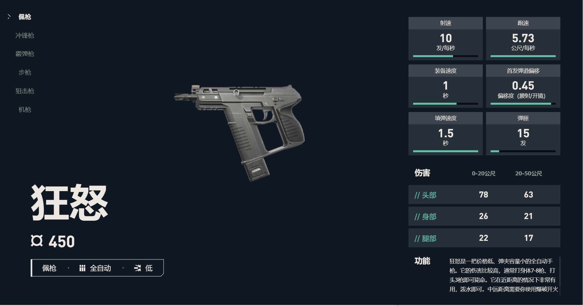 狂怒(售价450)是唯一的全自动手枪,射速高达10发/秒,弹容量13发,备弹39发。0-20米内,头部伤害78(衰减后63),上身26(衰减后21),下身22(衰减后17)。单发伤害和标配差不多,射速在手枪里是最快的,移动的扩散也比较小全自动射击带来的压制力是其最大优势,近距离秒伤可观,且可进行跑打,增加敌人命中难度。不过,高射速也使其容易出现马枪情况,弹容量低导致需频繁换弹,远距离弹道偏移明显。推荐在中近距离使用,搭配技能发挥优势,利用跑打技巧在手枪局抢占先机。