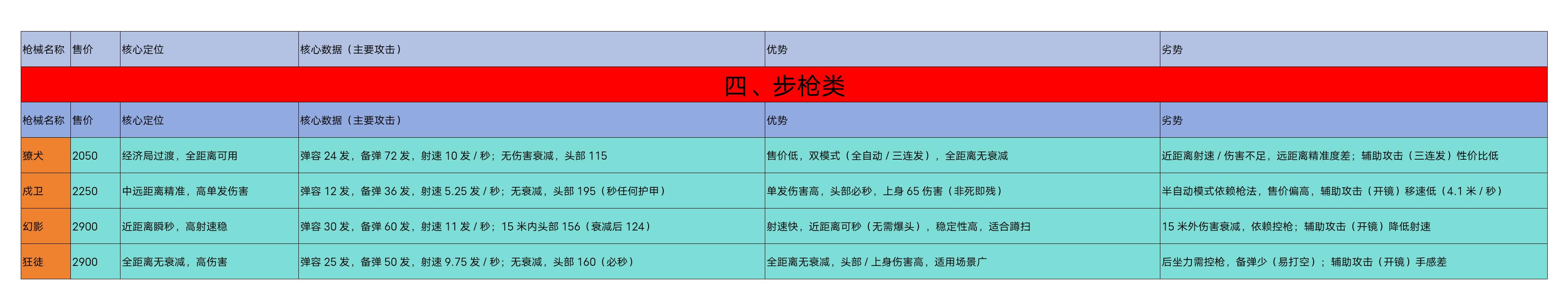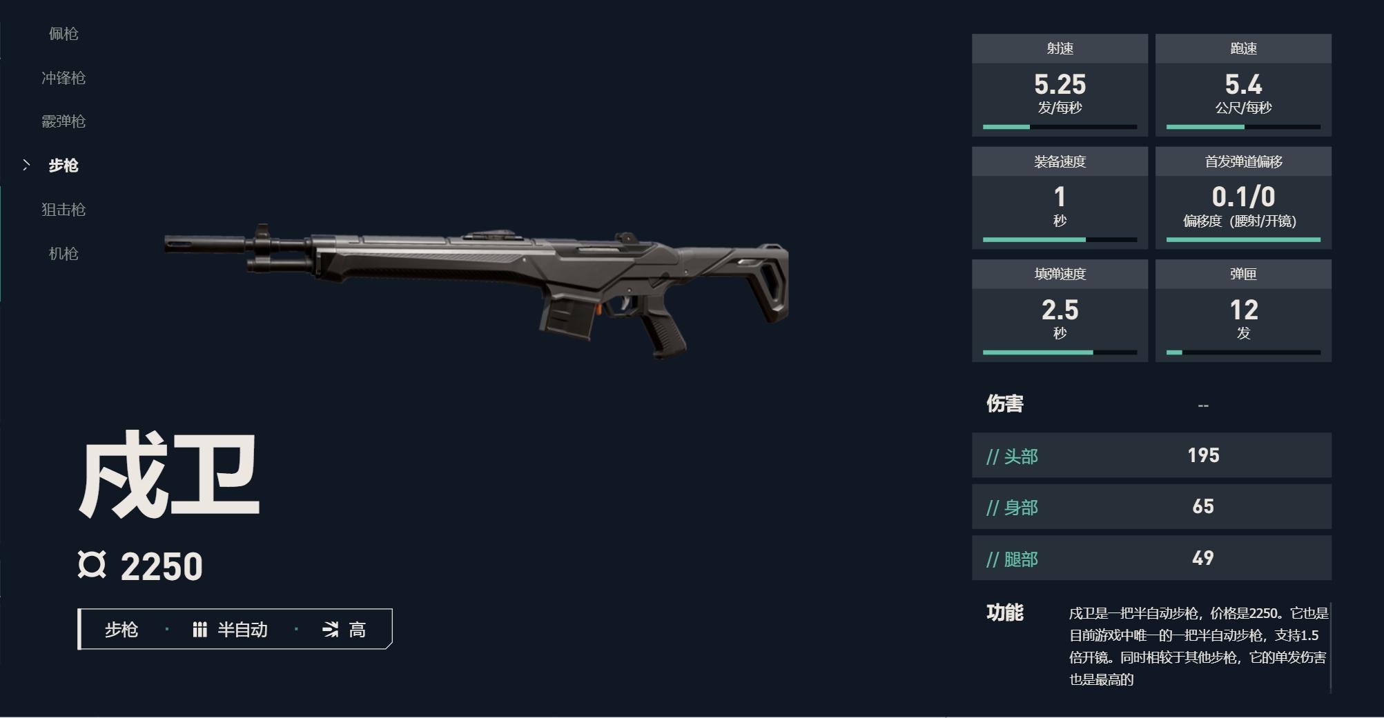戍卫(售价2250)单发伤害高,无衰减,精准度高,是半自动步枪,适用于中远距离对枪。弹容量12发,备弹36发,射速5.25发/秒,头部伤害195,上身65,下身48。命中头部可一枪毙命任何护甲敌人,上身伤害也能让敌人非死即残。但对枪法要求高,售价偏高,辅助攻击开镜模式移速低。适合队内枪法准、意识高的玩家,使