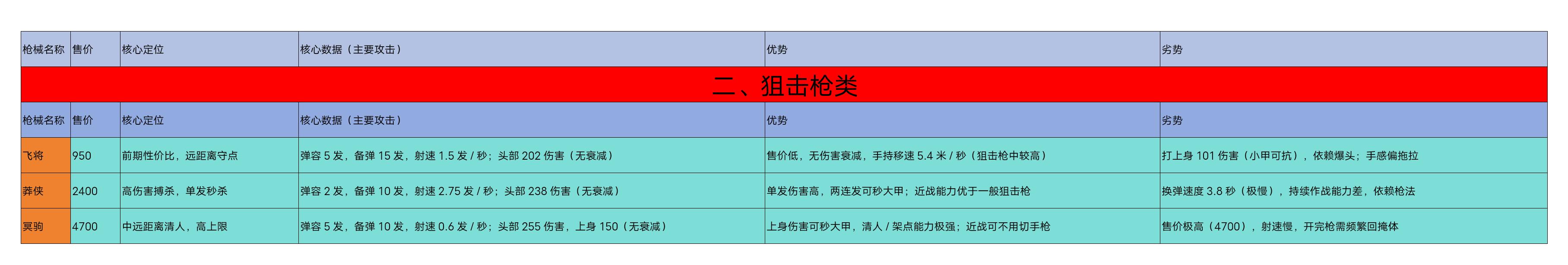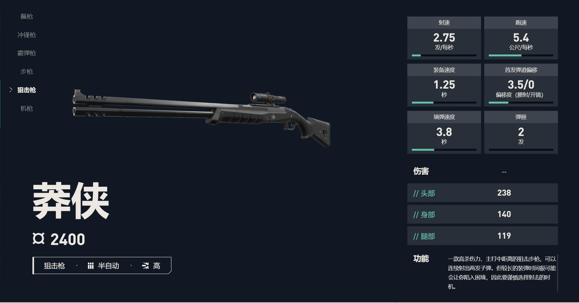莽侠(售价2400)高伤害但换弹慢。弹容量2发,备弹10发,射速2.75发/秒,头部伤害238,上身140,下身119。单发伤害高,两连发可秒大甲敌人,近战能力优于一般狙击枪。但3.8秒的换弹时间使其持续作战能力差,极度依赖枪法。实战中以架点为主,依靠威慑力影响敌人行动。